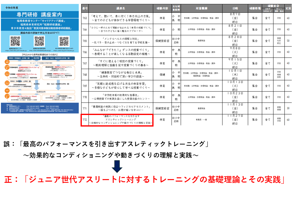 「「令和8年度専門研修の講座募集について(通知)7教セ第757号、7体研936号、7社セ第250号 令和8年3月19日」にて通知しておりました講座案内における講座名について誤りがありました ので訂正いたします